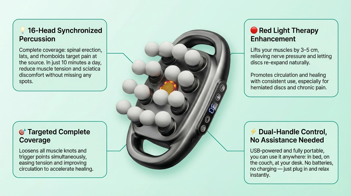 Reclaim your whole back with the ReviFlex™ 16-Head Massager. Whether it's scattered trigger points, workout soreness across multiple muscles, or tension you've been chasing with single-head devices, this isn't just another massager—it's your escape from incomplete relief.